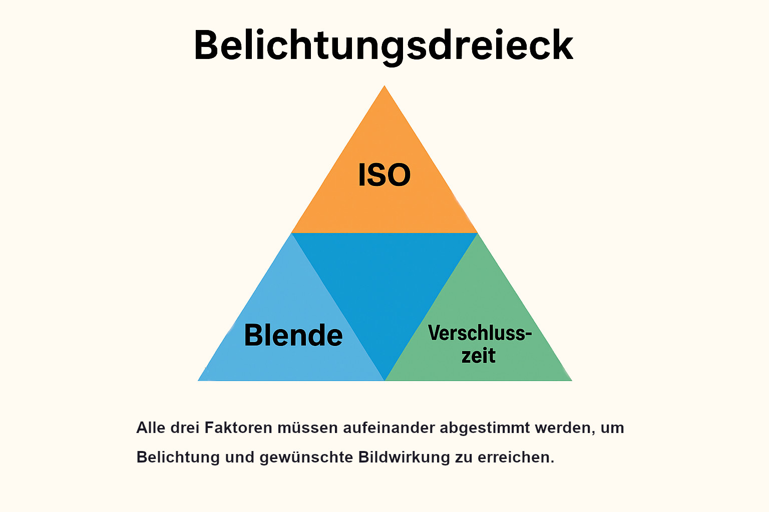 Das Belichtungsdreieck beschreibt das Zusammenspiel von ISO, Blende und Verschlusszeit, die gemeinsam die Helligkeit und Bildwirkung eines Fotos bestimmen. Der ISO-Wert verstärkt das Sensorsignal: niedrige Werte liefern rauschfreie Aufnahmen, hohe Werte ermöglichen Fotos bei wenig Licht, erhöhen aber das Rauschen. Die Blende reguliert die Lichtmenge und die Schärfentiefe: kleine Blendenzahlen erzeugen unscharfe Hintergründe für Portraits, große Zahlen bringen mehr Bildbereiche in Schärfe. Die Verschlusszeit steuert, wie lange Licht auf den Sensor fällt: kurze Zeiten frieren Bewegung ein, lange Zeiten erzeugen Bewegungsunschärfe und fließende Effekte. Alle drei Faktoren müssen aufeinander abgestimmt werden, um Belichtung und gewünschte Bildwirkung zu erreichen.