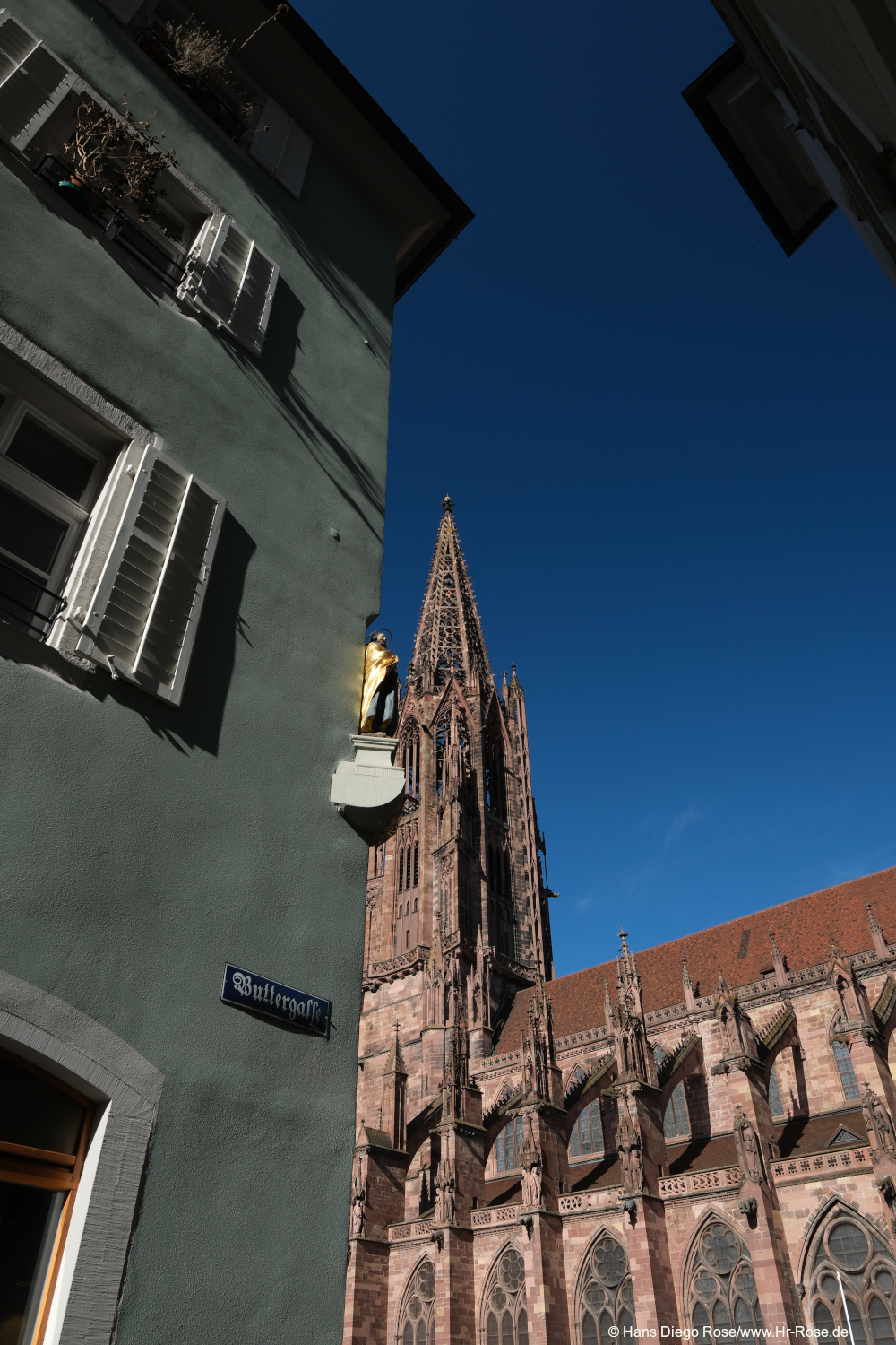Vergangenheit und Gegenwart: Vom Markt hebt sich der Blick zum Turm des Freiburger Münster. Die vertikale Struktur kontrastiert mit der geschäftigen Ebene des Platzes.