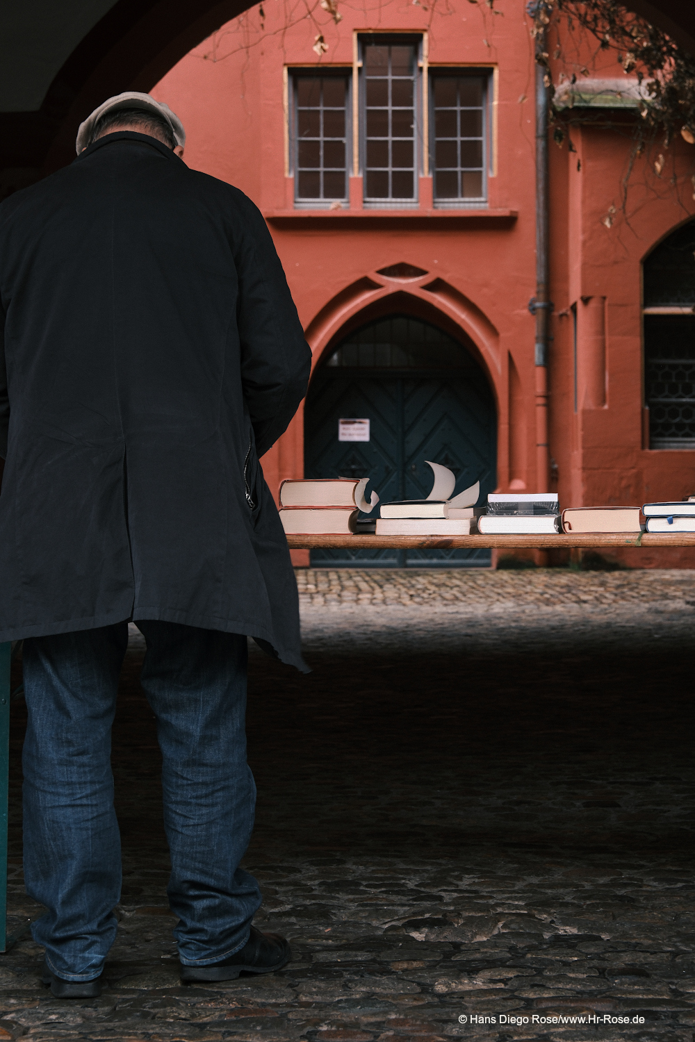 Über das Suchen und Finden: Am Freiburger Münstermarkt, unter den Arkaden des Roten Rathauses, bietet ein Stand antiquarische Bücher an. Auf einem schlichten Holztisch liegen Erstausgaben, Reiseberichte und vergessene Klassiker. Zwischen Marktgeräuschen entsteht ein stiller Moment, der Kultur und Alltagsleben verbindet.