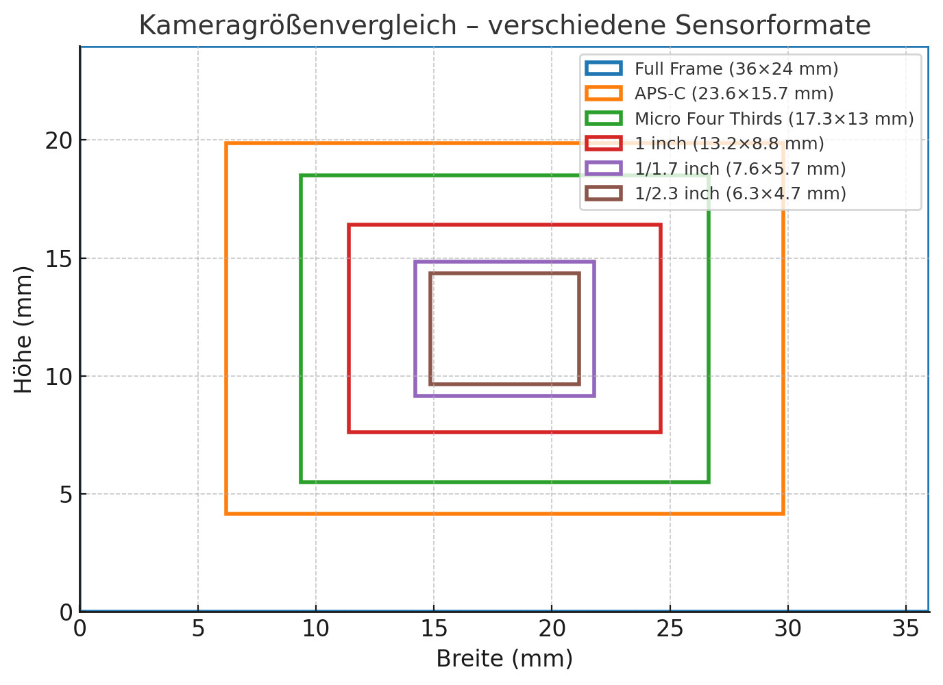 Die Sensorgröße beeinflusst Bildqualität, Gestaltung, Handhabung und Systemwahl. Vollformat (36 × 24 mm) bietet hohe Detailtreue, bessere Low-Light-Leistung und geringe Schärfentiefe – ideal für Porträts. Kleinere Sensoren wie APS-C (23,6 × 15,7 mm) oder Micro Four Thirds (17,3 × 13 mm) sind kompakter, leichter und günstiger – ideal für Reisen oder Streetfotografie.