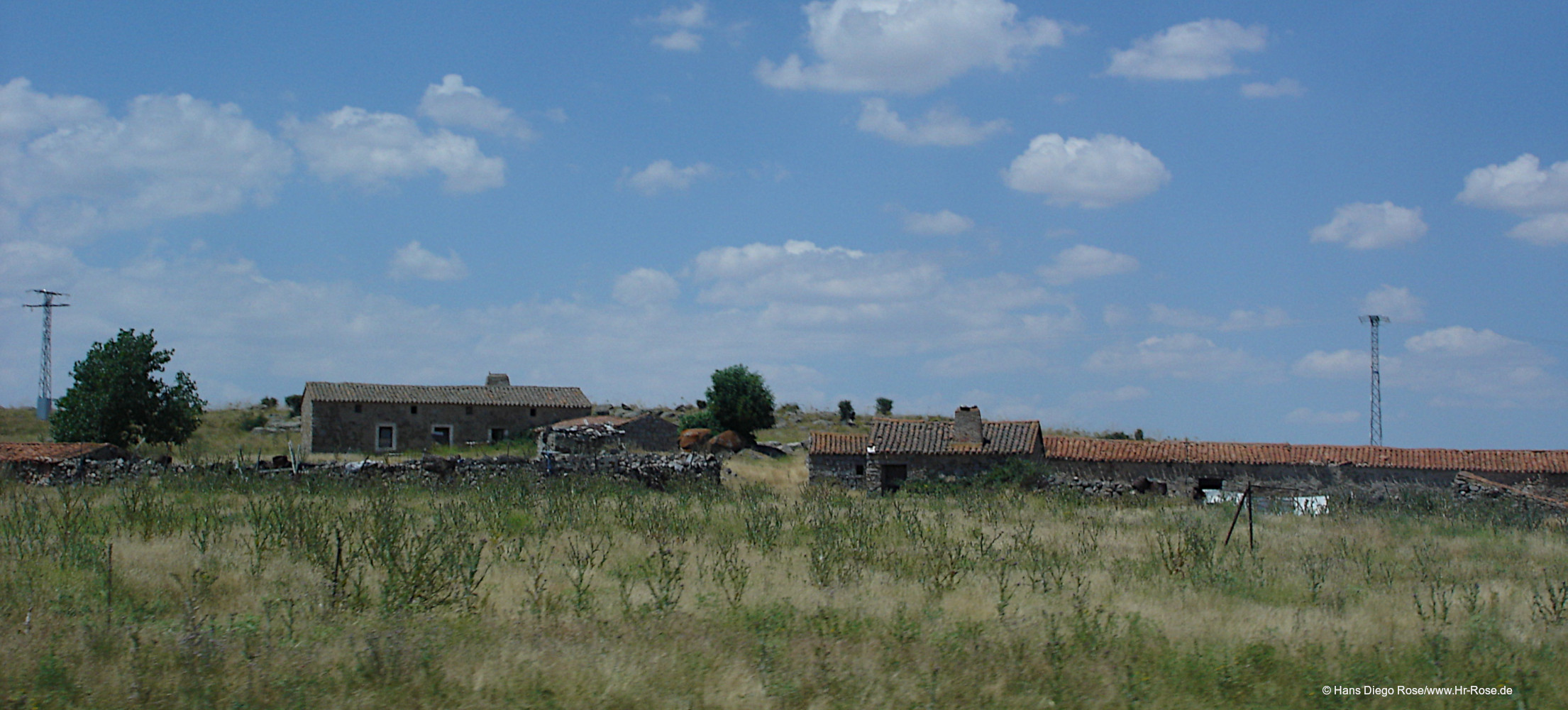 Das Bild wirkt unspektakulär – und genau darin liegt seine Kraft. Die niedrigen Steinhäuser mit ihren roten Ziegeldächern scheinen Relikte einer anderen Zeit zu sein. Das hohe Gras wirkt, als würde die Natur sich langsam zurückholen, was ihr gehört. Im Hintergrund stehen Strommasten – ein leiser Hinweis auf die Gegenwart, die sich neben die Vergangenheit gestellt hat.