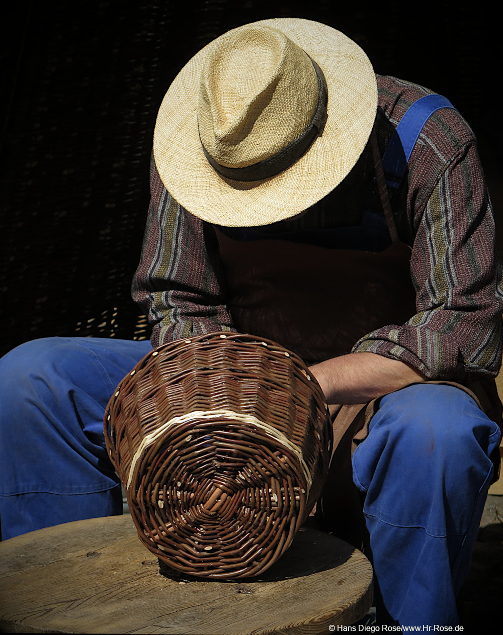 Mit präzisen Bewegungen verwandelt der Korbflechter einfache Weidenzweige in einen kunstvollen Weidenkorb. Das Bild fängt nicht nur die handwerkliche Arbeit ein, sondern auch die besondere Hingabe, die hinter jedem Handgriff steckt.