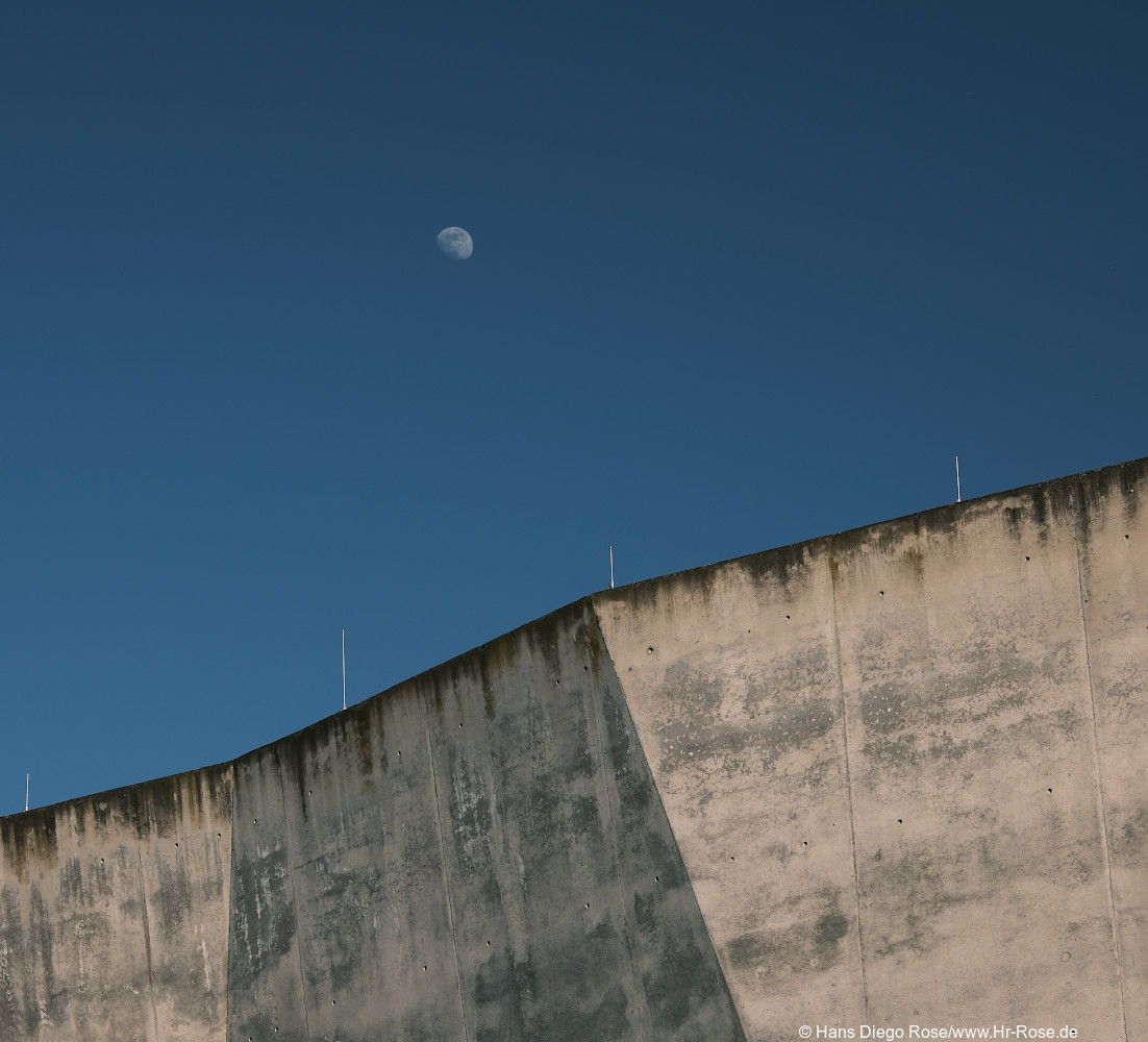 Die Szene wirkt fast abstrakt. Eine massive Betonwand zieht sich als ruhige Linie durch das Bild, darüber öffnet sich ein weiter, klarer Himmel. Der Mond erscheint klein und distanziert – ein stiller Kontrapunkt zur schweren Architektur darunter.