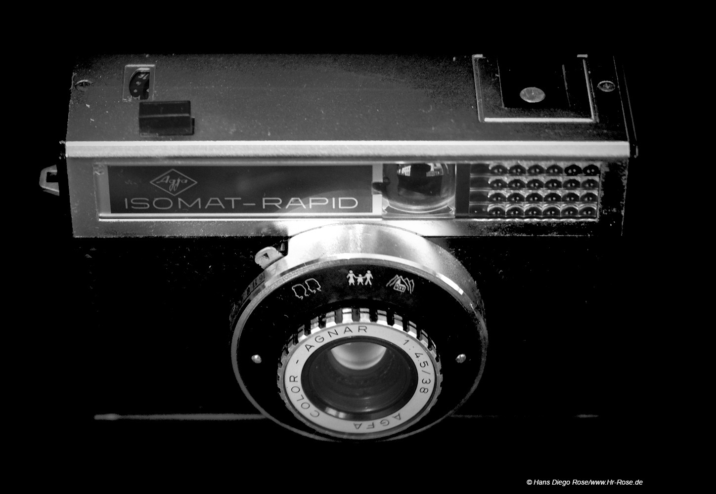 Der Zonenfokus ist eine (alte) praktische Methode, um die Schärfe in der Fotografie einzustellen, indem Sie den Fokus auf vordefinierte Entfernungszonen wählen. Bei der Agfa Isomat Rapid, einer Kamera mit Zonenfokus, finden Sie eine Skala mit drei Entfernungszonen: Zwei Köpfe (nah), eine Gruppe von drei Personen (mittel), und eine Gebirgslandschaft mit einer Kirche davor (fern). Diese Symbole helfen Ihnen, die Schärfe auf einfache Weise anzupassen, ohne exakte Entfernungen messen zu müssen.